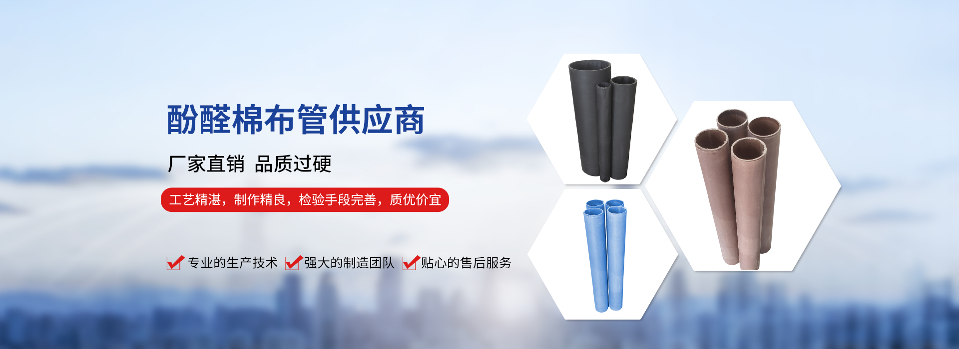 本公司主要产品有:酚醛棉布管系列、酚醛夹布支撑环系列、密封件系列等产品,可承接大型棉布管的制作,直径20MM--1400MM,长度可达1400MM的产品。产品应用于工程机械、煤矿机械、化工机械、军工设备、纺织机械、冶金机械等行业。现拥有雄厚的技术力量,先进的生产设备,齐全的检测手段,专业的工艺技术。并有多年的生产实践经验。品种繁多,规格齐全,产品畅销国内,深受用户的欢迎和信赖。